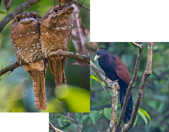 You may lucky to see the wonderful pair of Sri Lanka Frogmouths cuddling up to each other on a branch when you aret trekking along your path silently or a Green-billed Coucal flying sedately across the river and giving you a eyeball view. Walks in the forests will bring you many special birds which can be listed as follows